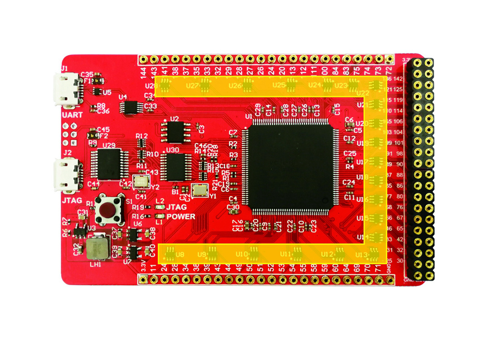 88個(gè)開(kāi)放IO全部帶有ESD防護(hù)芯片(圖片中黃色區(qū)域芯片),防止損壞